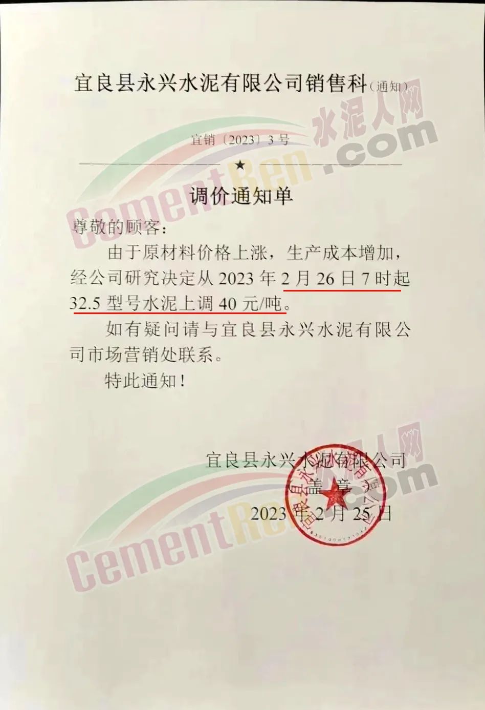 宜良縣永興水泥有限公司銷售科通知,由于原材料價格上漲,生產成本增加,經公司研究決定從2023年2月26日7時起32.5型號水泥上調40元/噸。