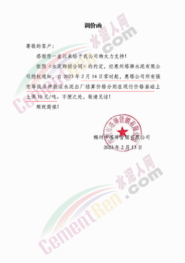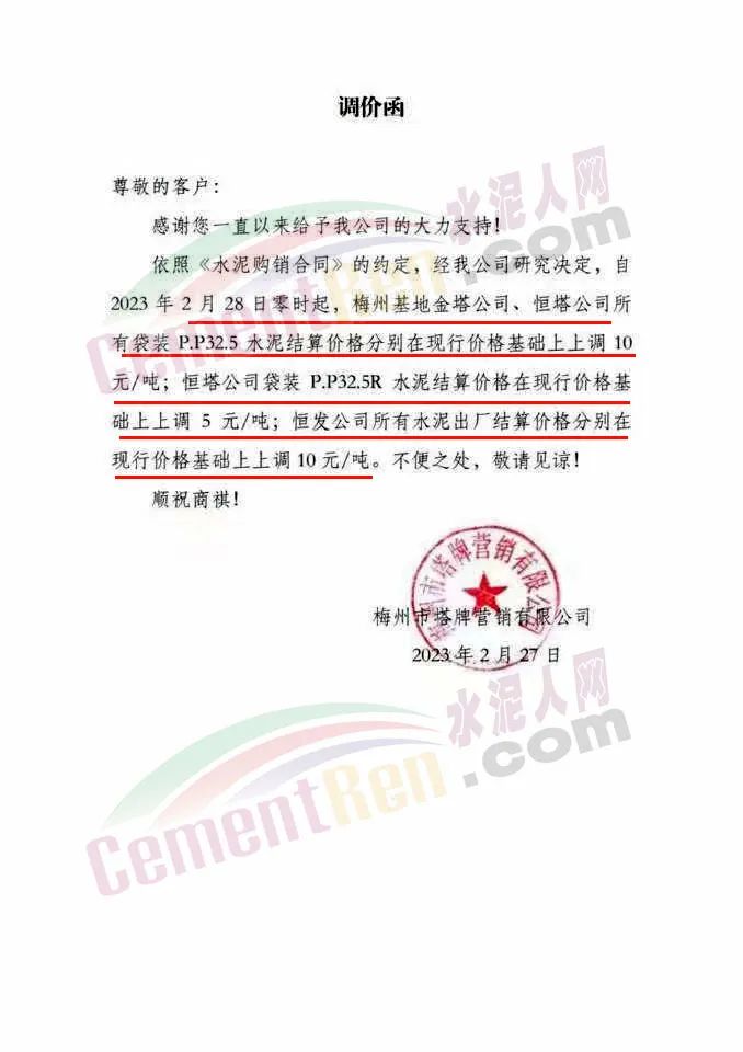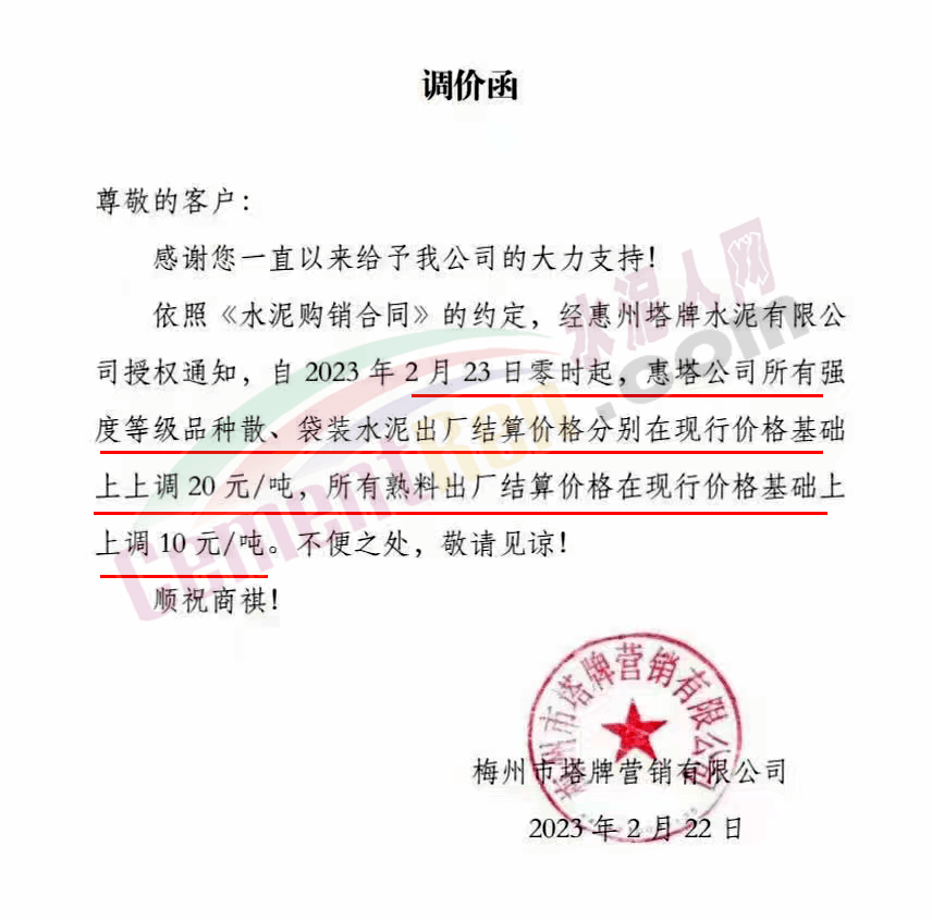 水泥人網(wǎng)通訊員消息,日前梅州市塔牌管銷有限公司通知,自2023年2月28日零時(shí)起,梅州基地金塔公司、恒塔公司所有袋裝PP325水泥結(jié)算價(jià)格分別在現(xiàn)行價(jià)格基礎(chǔ)上上調(diào)10元/噸;恒塔公司袋裝PP32.5R水泥結(jié)算價(jià)格在現(xiàn)行價(jià)格基礎(chǔ)上上調(diào)5元/噸;恒發(fā)公司所有水泥出廠結(jié)算價(jià)格分別在現(xiàn)行價(jià)格基礎(chǔ)上上調(diào)10元/噸。