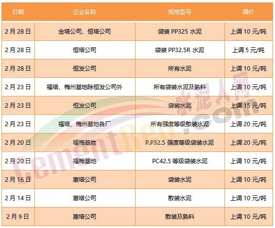 2月20日:福梅基地各廠所有P.P32.5強(qiáng)度等級(jí)袋裝水泥出廠結(jié)算價(jià)格分別在現(xiàn)行價(jià)格基礎(chǔ)上上調(diào)20元/噸;PC42.5等級(jí)袋裝水泥出廠結(jié)算價(jià)格分別在現(xiàn)行價(jià)格基礎(chǔ)上上調(diào)10元/噸。