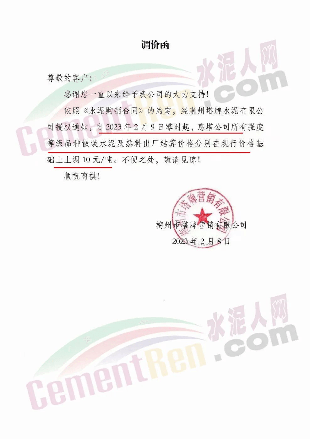 據(jù)水泥人網(wǎng)信息中心數(shù)據(jù),2月內(nèi)塔牌水泥已經(jīng)陸續(xù)發(fā)出近10份漲價(jià)函。