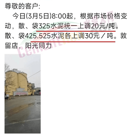 日前,河南區域陽光同力通知3月5日8時起,根據市場價格變動,散、袋32.5水泥統一上調20元/噸。散、袋42.5、52.5水泥各上調30元/噸。