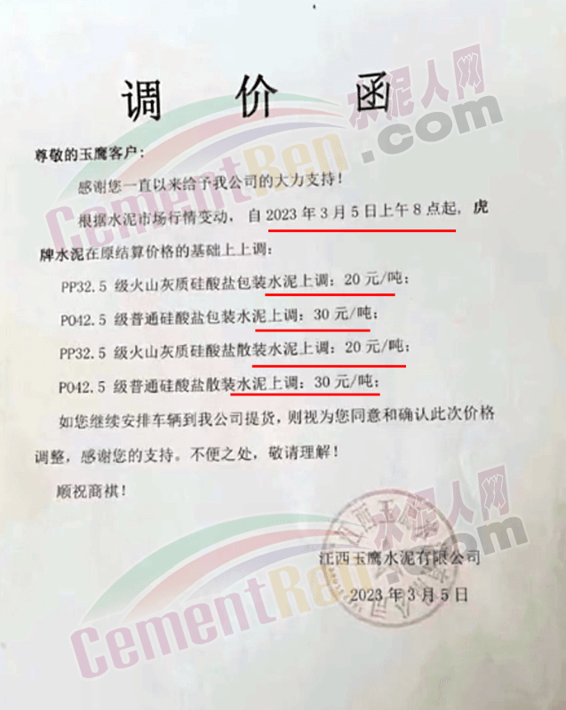 江西萬年青水泥贛州銷售部通知,根據當前市場行情,經公司研究決定,自2023年3月5日8時起,各基地發往贛州區域各品種袋散裝水泥出廠價格在原價格基礎上上調20元/噸。