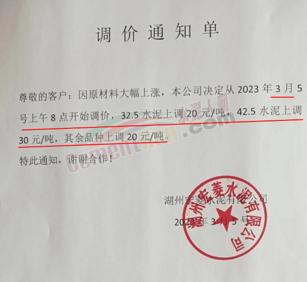 浙江湖州宏菱水泥通知,因原材料大幅上漲,公司決定從2023 年3月5號上午8點開始調價,32.5水泥上調 20元/噸,42.5水泥上調30元/噸,其余品種上調20元/噸。