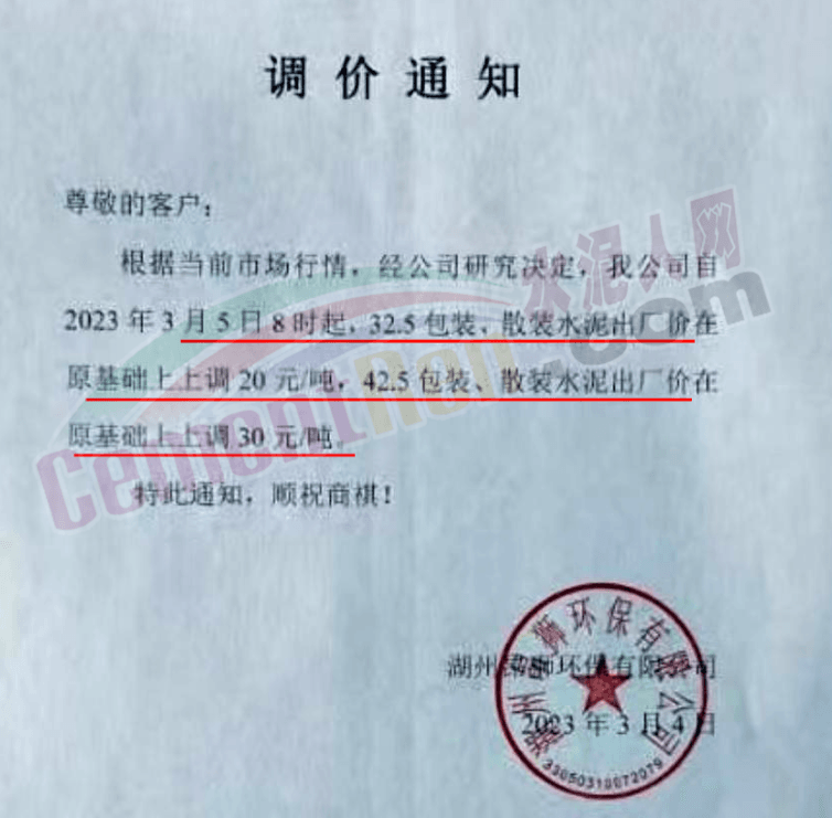 湖州昂獅環保有限公司通知,根據當前市場行情,經公司研究決定,公司自2023年3月5日8時起,32.5包裝、散裝水泥出廠價在原基礎上上調20元/噸,42.5包裝、散裝水泥出廠價在原基礎上上調30元/噸。