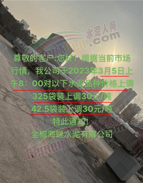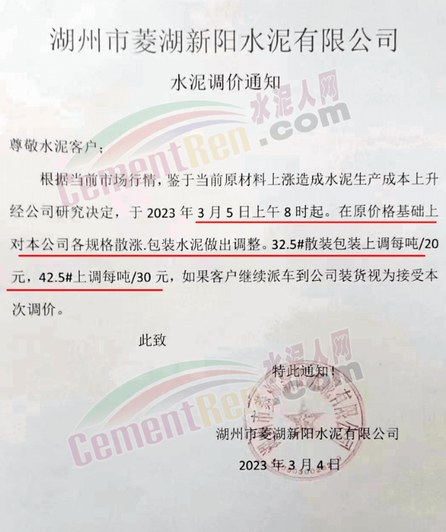 湖州市菱湖新陽水泥有限公司通知,根據當前市場行情,鑒于當前原材料上漲造成水泥生產成本上升經公司研究決定,于2023年3月5日上午8時起。32.5水泥上調20元/噸,42.5水泥上調30 元/噸。