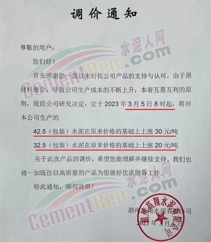 湖州高翔水泥有限公司通知,由于原材料漲價,導致公司生產成本的不斷上升,本著互惠互利的原則,現經公司研究決定,于2023年3月5日8時起,將對本公司生產的42.5(包裝)水泥在原來價格的基礎上上漲 30元/噸,325(包裝)水泥在原來價格的基礎上上漲20元/噸。
