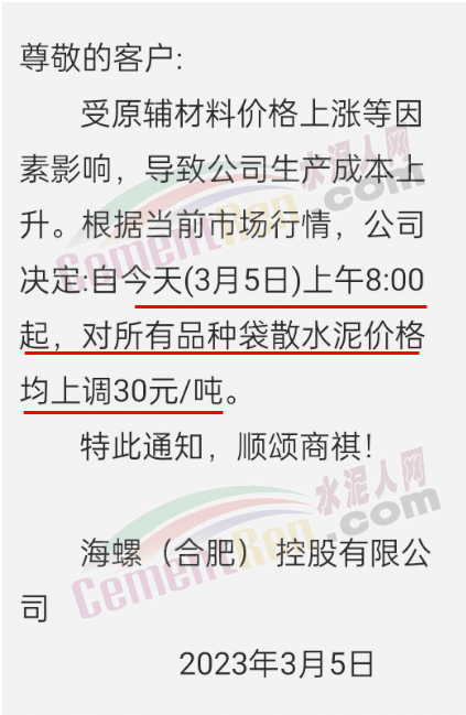 海螺(合肥)控股有限公司通知,受原輔材料價格上漲等因素影響,導致公司生產成本上升。根據當前市場行情,公司決定,自3月5日上午8時起,對所有品種袋散水泥價格均上調30元/噸。