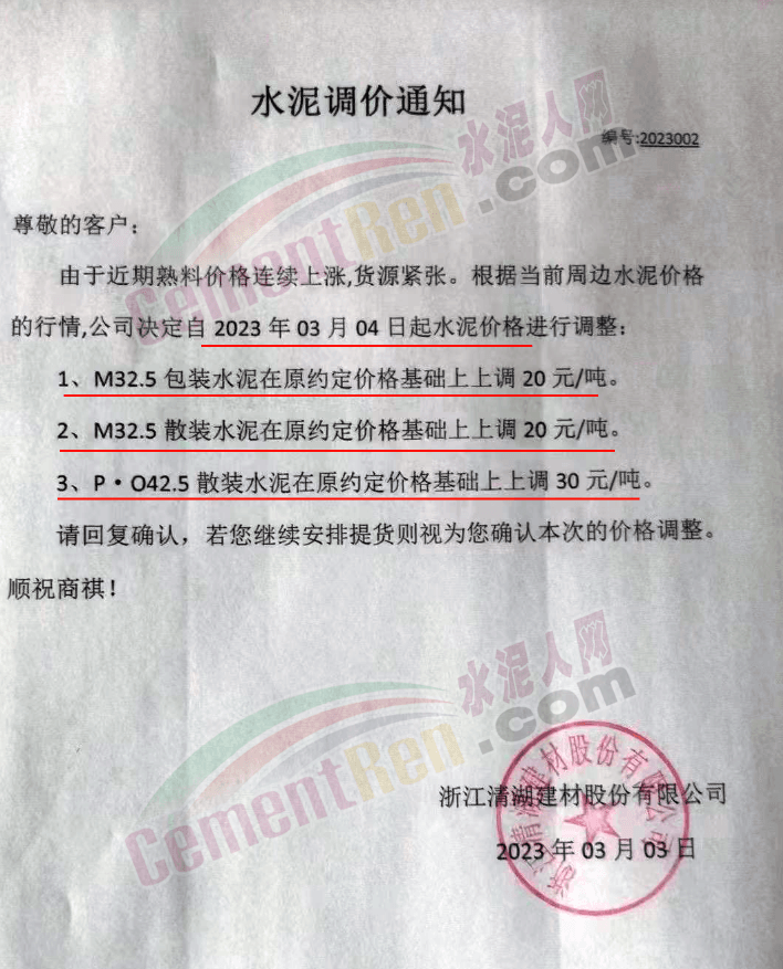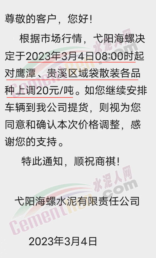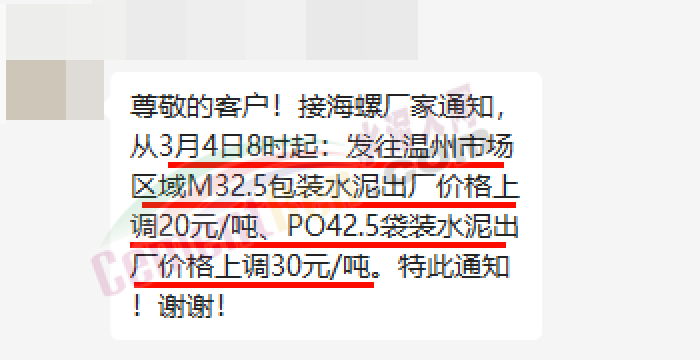 海螺經銷商發消息稱,接海螺廠家通知,從3月4日8時起,發往溫州市場區域M32.5包裝水泥出廠價格上調20元/噸、P.O42.5袋裝水泥出廠價上調30元/噸。