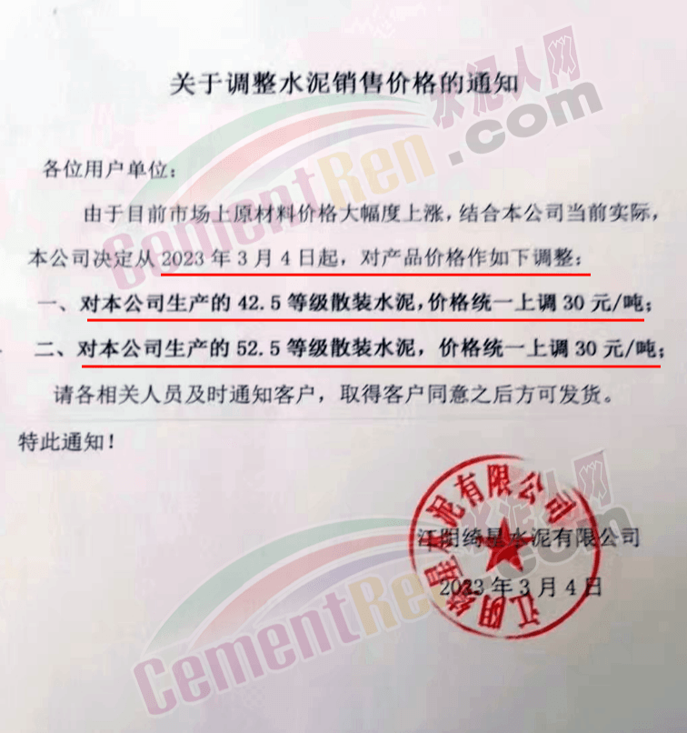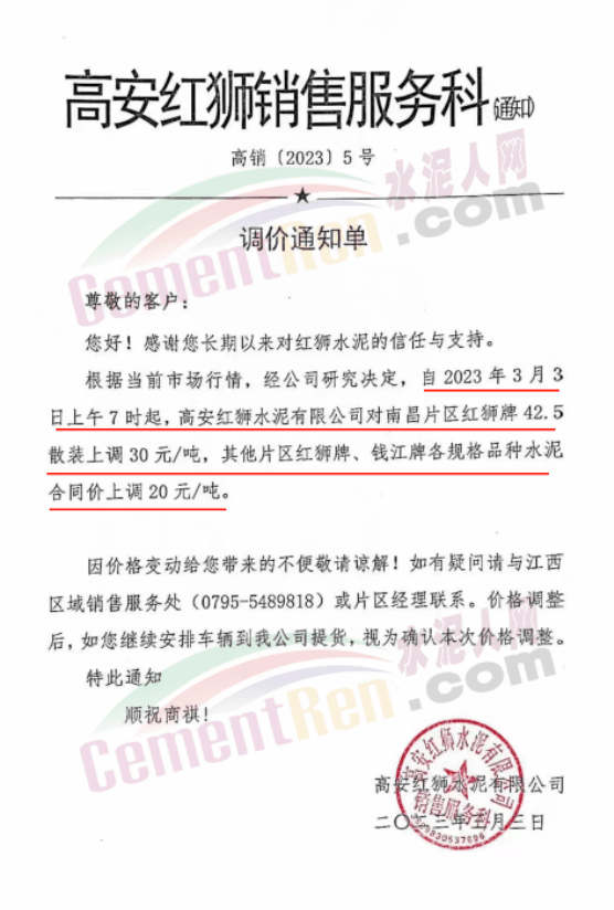 高安紅獅水泥銷售服務科通知,根據當前市場行情,經公司研究決定,自2023年3月3日上午7時起,高安紅獅水泥有限公司對南昌片區紅獅牌42.5散裝上調30元/噸,其他片區紅獅牌、錢江牌各規格品種水泥合同價上調20元/噸。
