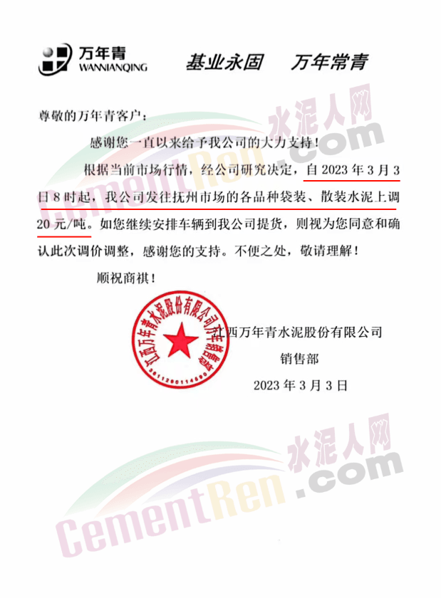 江西萬年青水泥股份有限公司通知,根據當前市場行情,經公司研究決定,自2023年3月3日8時起,公司發往撫州市場的各品種袋裝、散裝水泥上調20元/噸。