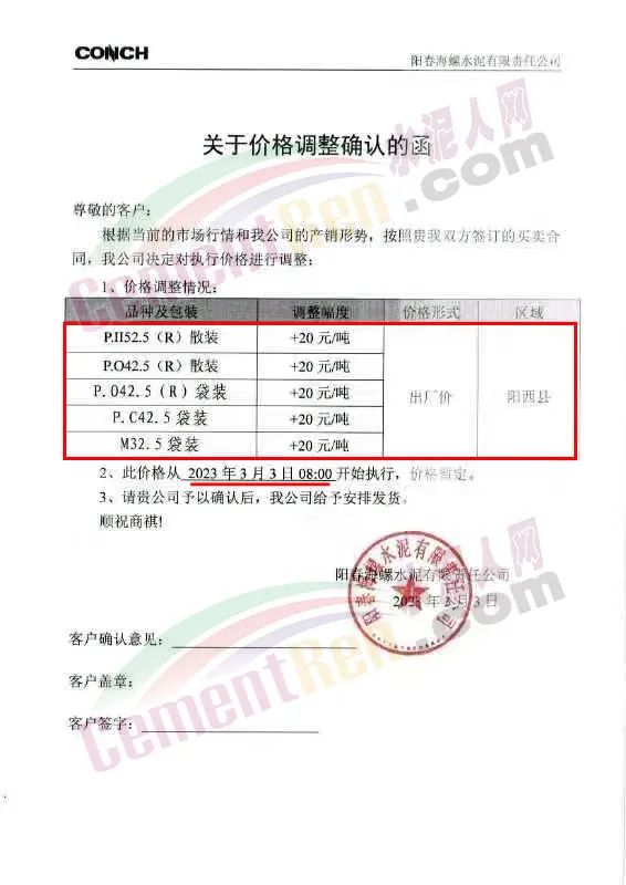 日前,陽春海螺水泥有限責任公司通知,從3月3日8時起各標號水泥陽西縣區域出廠價上調20元/噸。