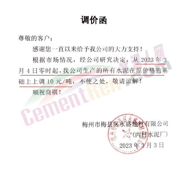 梅州市梅縣區永盛建材有限公司通知,3月4日零時起,公司生產的所有水泥在原價基礎上上調10元/噸。
