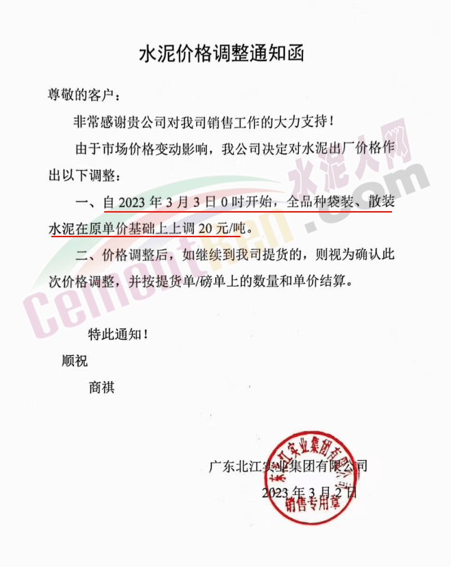 廣東北江實業集團有限公司通知,由于市場價格變動影響,公司決定自3月3日0時開始全品種水泥上調20元/噸。