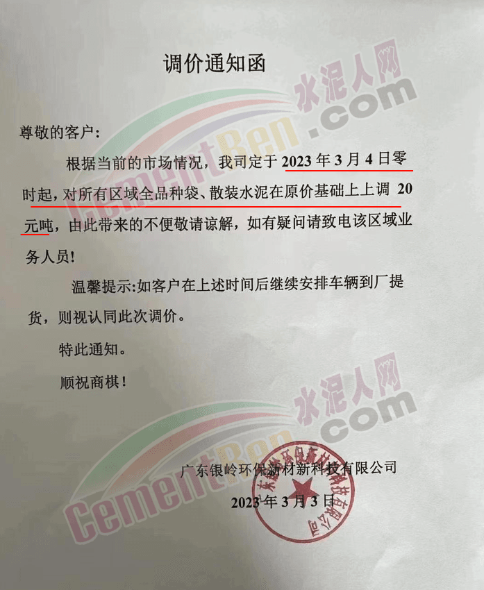 廣東銀嶺環保新材料科技有限公司通知,3月4日對全區域水泥價格上調20元/噸。