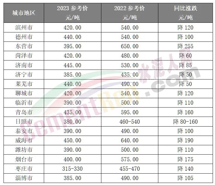 水泥人網信息中心數據顯示,山東東營水泥價格較上年同期大跌255元/噸,威海、煙臺水泥價格跌190元/噸、170元/噸;日照今年3月初較上年同期報價下跌80-160元/噸,棗莊區域水泥價格也下跌了140元/噸左右。