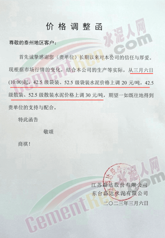江蘇磊達股份有限公司通知泰州地區客戶稱,根據市場行情的變化,結合本公司的生產等實際,從3月6日10時起,42.5級袋裝、52.5級袋裝水泥價格上調20元/噸,425級散裝、52.5級散裝水泥價格上調30元/噸。