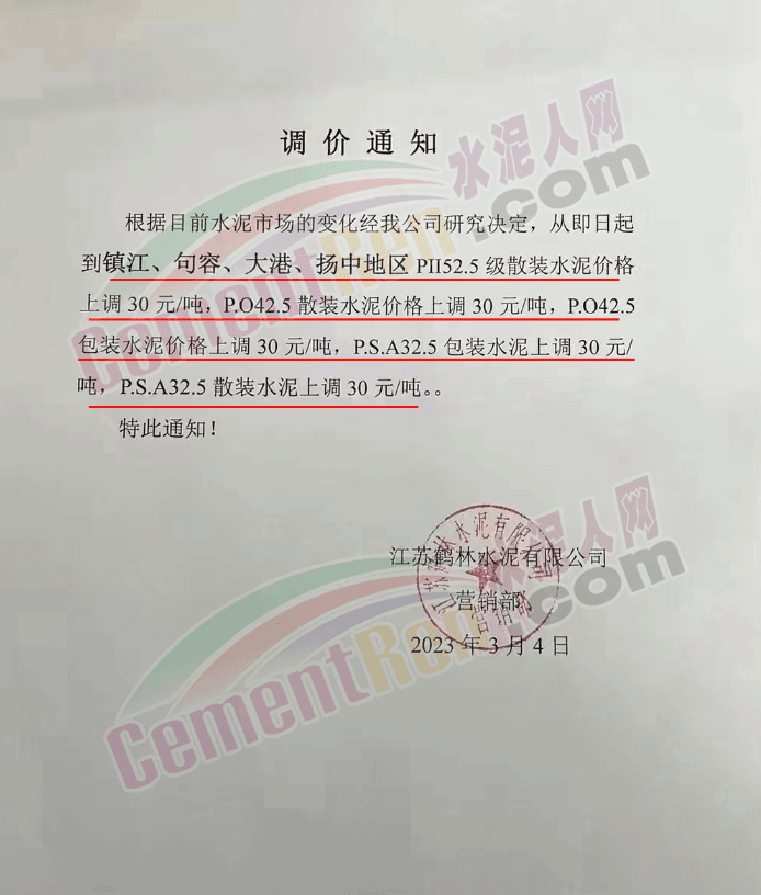 3月4日,江蘇鶴林水泥有限公司通知,對鎮江、句容、大港、揚中地區各標號水泥上調30元/噸。