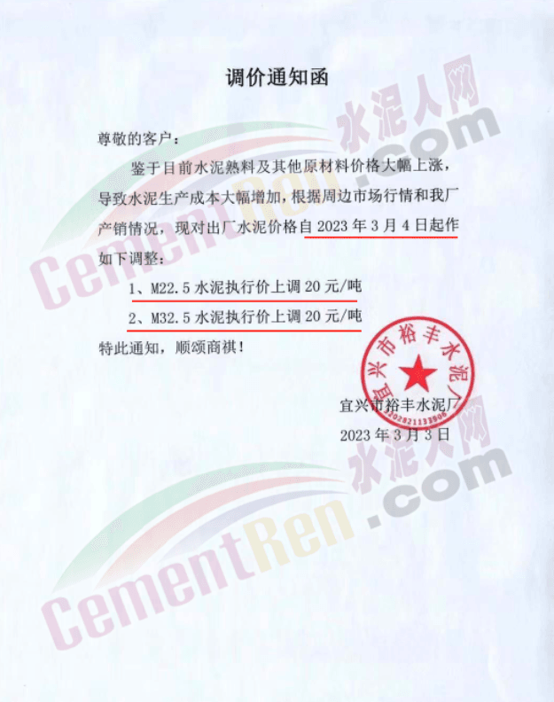 宜興市裕豐水泥廠通知,鑒于目前水泥熟料及其他原材料價格大幅上漲,導致水泥生產成本大幅增加,根據周邊市場行情和工廠產銷情況,自2023年3月4日M22.5水泥執行價上調20元/噸,M32.5水泥執行價上調20元/噸。