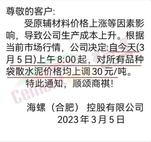 3月5日,海螺(合肥)控股有限公司通知上調所有品種袋散裝水泥價格30元/噸。