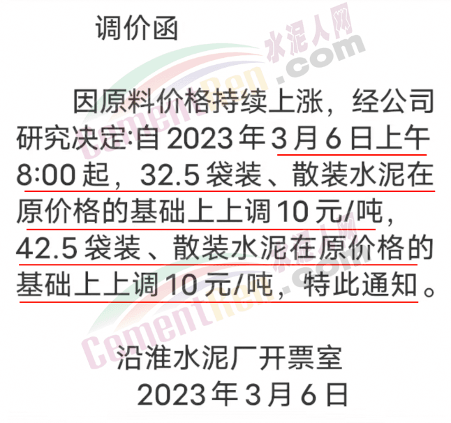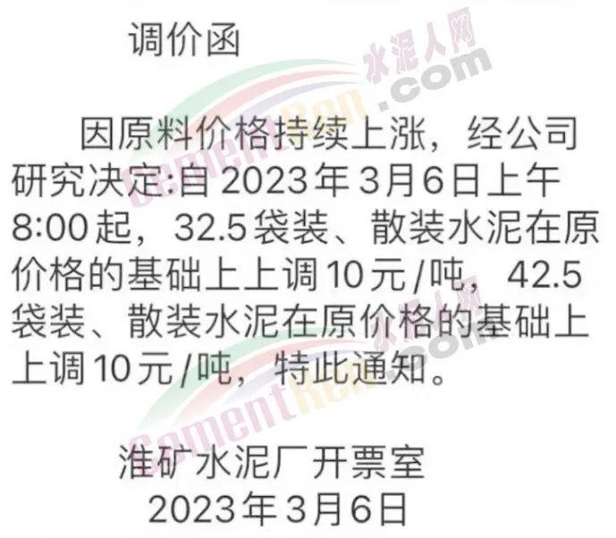 淮南市盤龍水泥、淮南禹山水泥公司、淮礦水泥廠、沿淮水泥廠通知,自3月6日起,水泥價格上調10元/噸。