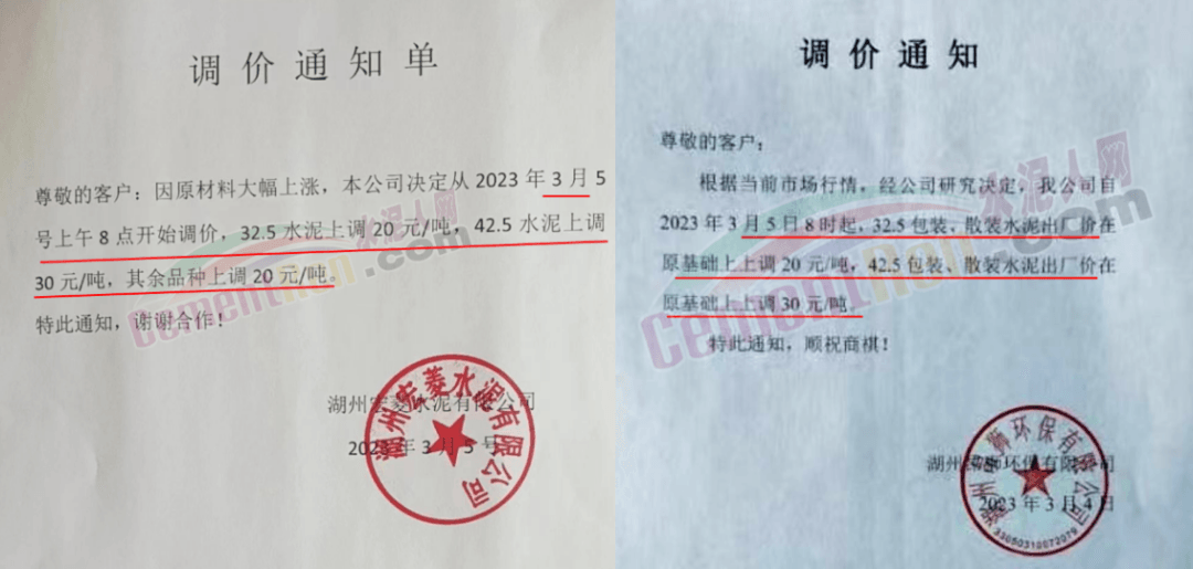 3月5日前后,海螺水泥經銷商通知,發往溫州市場水泥價格上調20-30元/噸,其中M32.5包裝水泥上調20元/噸、P.O42.5袋裝水泥上調30元/噸。