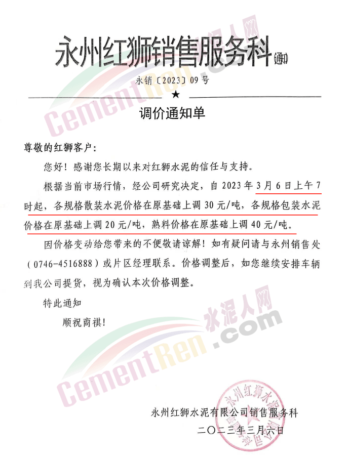 永州紅獅銷售服務科通知,根據當前市場行情,經公司研究決定,自2023年3月6日上午7時起,各規格散裝水泥價格在原基礎上調30元/噸,各規格包裝水泥價格在原基礎上調20元/噸,熟料價格在原基礎上調40元/噸。