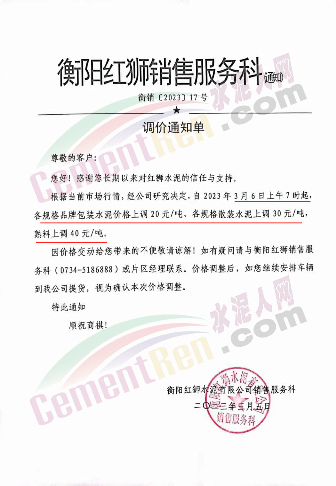 衡陽紅獅銷售服務科通知,根據當前市場行情,經公司研究決定,自2023年3月6日上午7時起各規格品牌包裝水泥價格上調20元/噸、各規格散裝水泥上調30元/噸,熟料上調40元/噸。