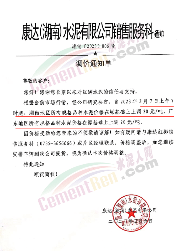 康達(湖南)水泥有限公司銷售服務科通知,根據當前市場行情,經公司研究決定,自2023年3月7日上午7時起,湖南地區所有規格品種水泥價格在原基礎上上調30元/噸,廣東地區所有規格品種水泥價格在原基礎上上調20元/噸。