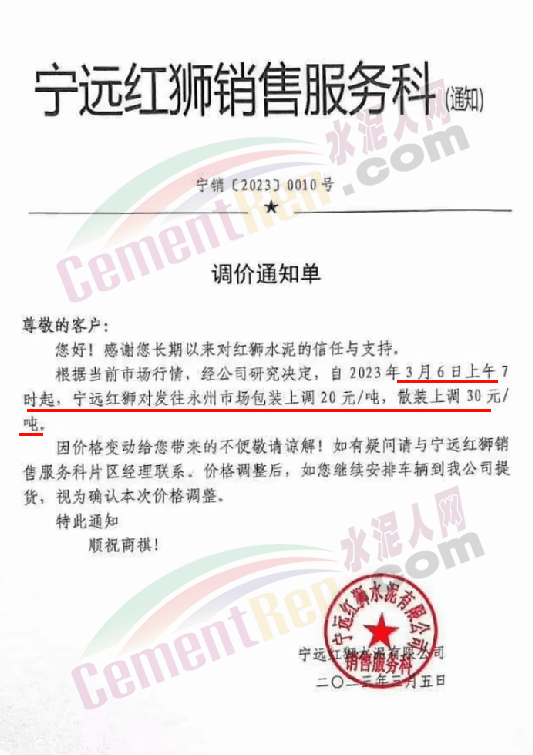 寧遠紅獅水泥銷售服務科通知,3月6日上午7時起,對發往永州市場水泥價格上調20-30元/噸。