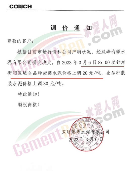 雙峰海螺水泥通知,自2023年3月6日8時起針對衡陽區域全品種袋裝水泥價格上調20元/噸,全品種散裝水泥價格上調30元/噸。