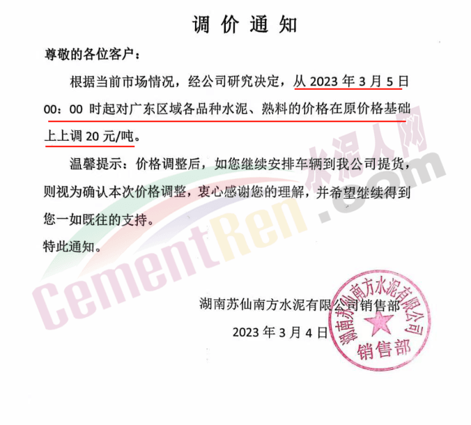 湖南蘇仙南方水泥銷售部通知,根據當前市場情況,經公司研究決定,從2023年3月5日0時起對廣東區域各品種水泥、熟料的價格在原價格基礎上上調20元/噸。