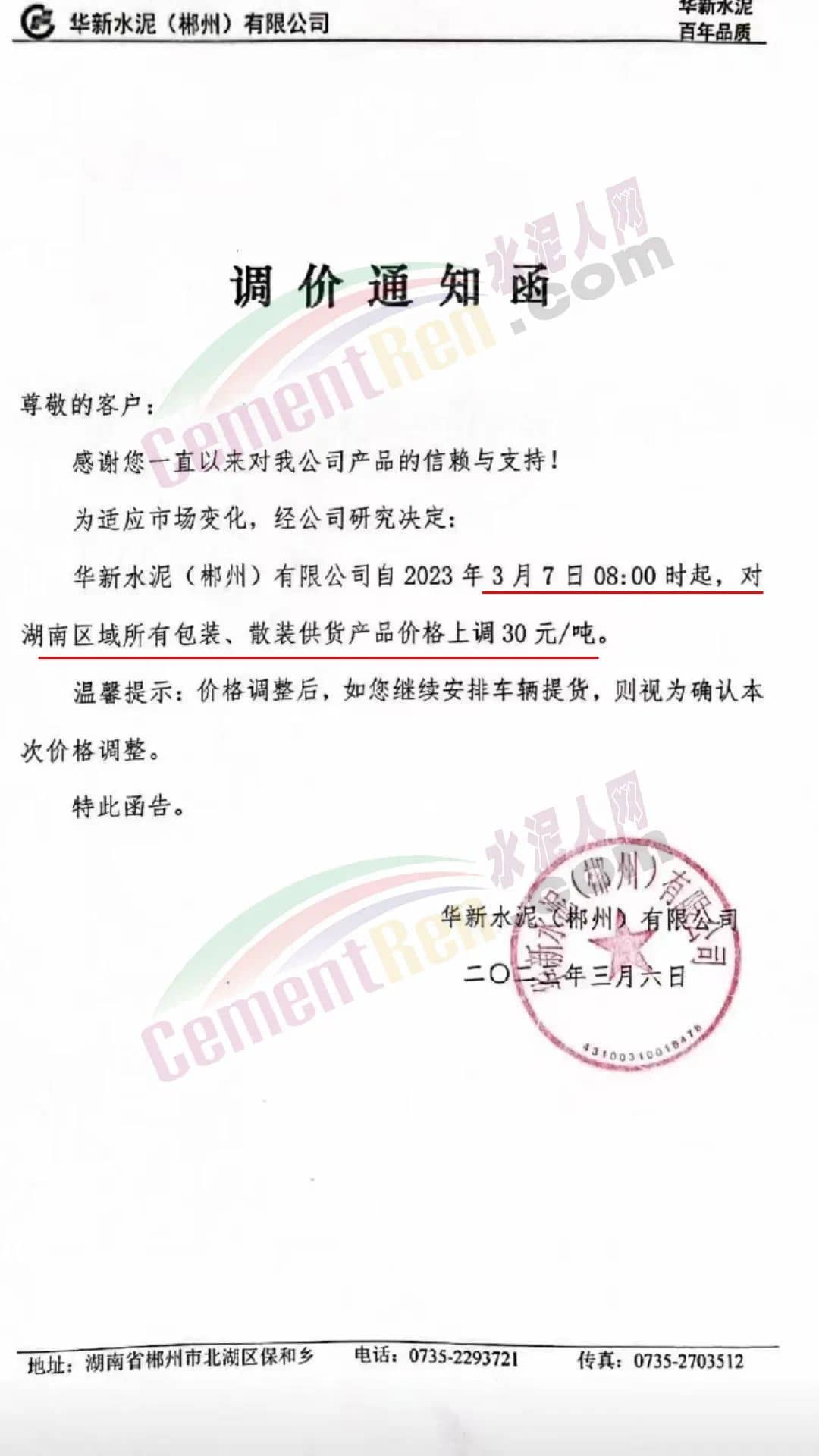 華新水泥(郴州)有限公司通知,自3月7日8時起,對湖南區域所有包裝、散裝供貨產品價格上調30元/噸。
