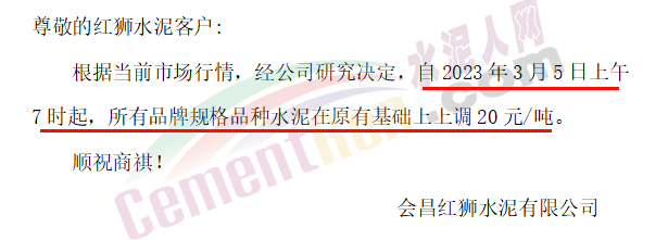會昌紅獅水泥有限公司通知,根據當前市場行情,經公司研究決定,自2023年3月5日上午7時起,所有品牌規格品種水泥在原有基礎上上調20元/噸。