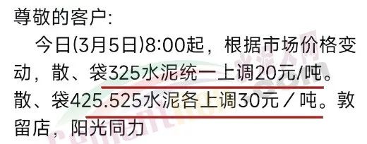 日前,河南區域陽光同力通知3月5日8時起,根據市場價格變動,散、袋32.5水泥統一上調20元/噸。散、袋42.5、52.5水泥各上調30元/噸。