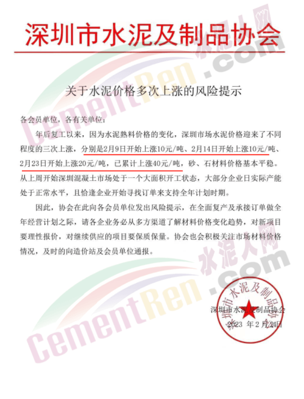 深圳市水泥及制品協會發出提示函稱,自年后復工以來,因為水泥熟料價格的變化,深圳市場水泥價格迎來了不同程度的三次上漲,分別是2月9日開始上漲10元/噸、2月14日開始上漲10元/噸、2月23日開始上漲20元/噸,已累計上漲40元/噸,砂、石材料價格基本平穩。協會在此向各會員單位發出風險提示,在全面復產及承接訂單做全年經營計劃之際,請各企業務必從多方渠道了解材料價格變化趨勢,對新項目要理性報價,采購穩定、合格的原材料以保障混凝土的供應,同時確保混凝土質量。