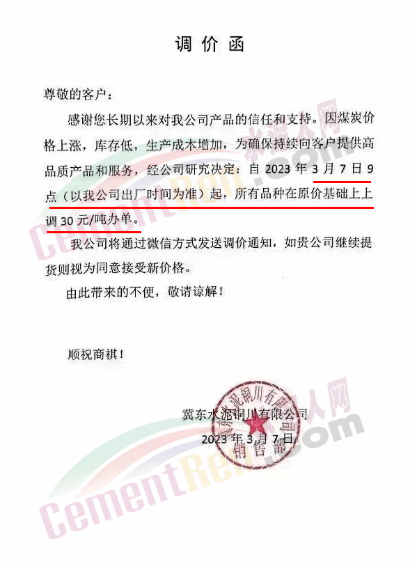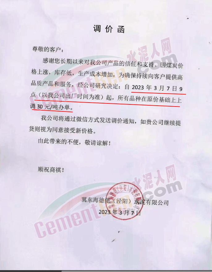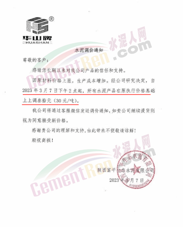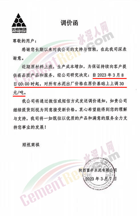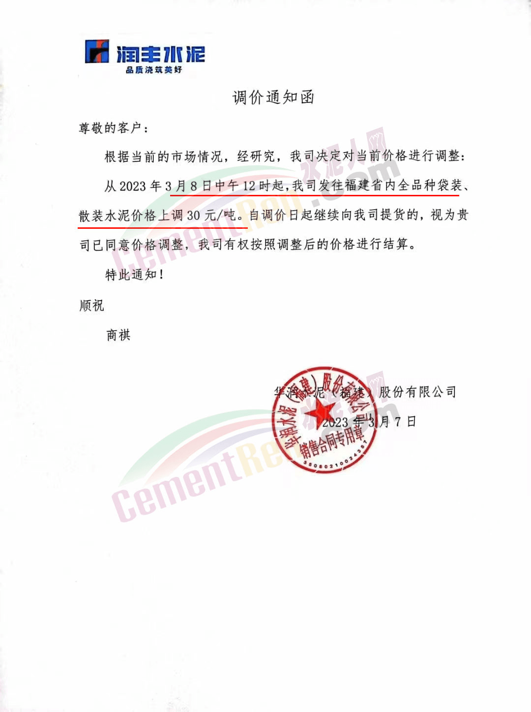 華潤水泥通知,從3月8日中午12時起,公司發往福建省全品種袋裝、散裝水泥價格上調30元/噸。