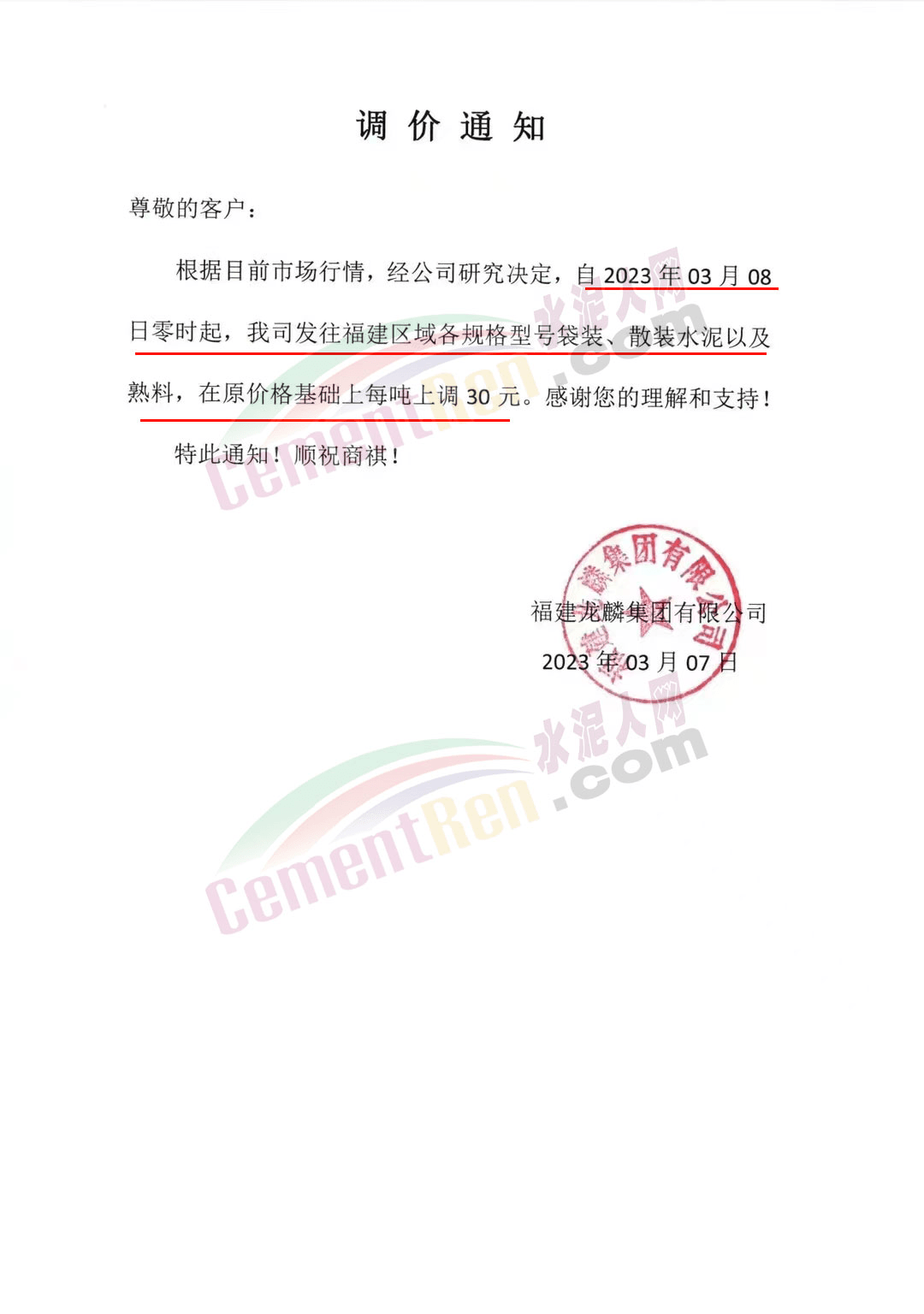 福建龍麟集團有限公司通知,3月8日零時起,發往福建區域各規格型號袋裝、散裝水泥以及熟料在原價基礎上上調30元/噸。