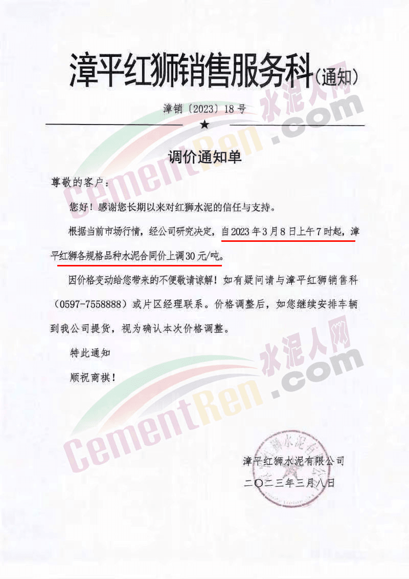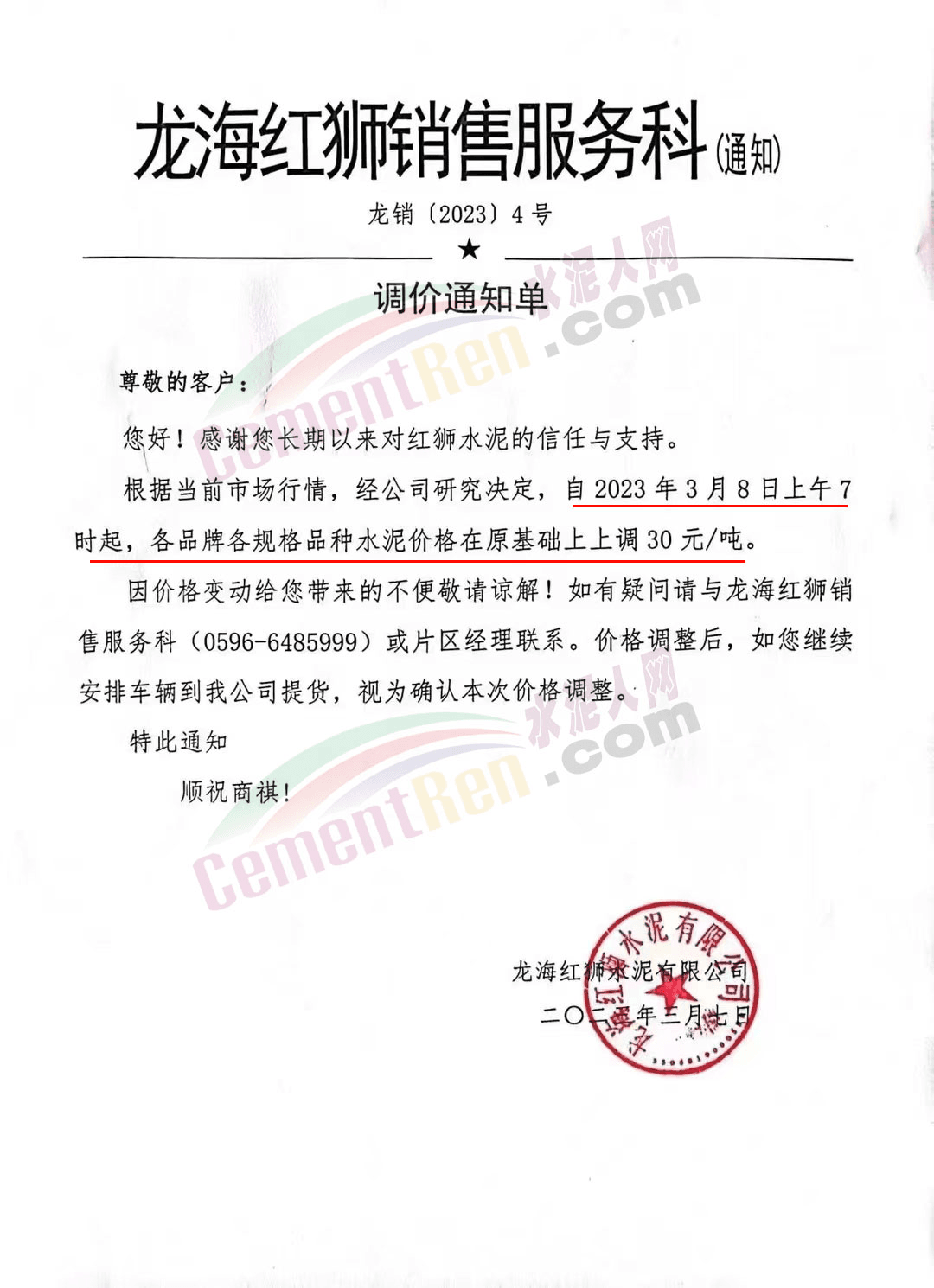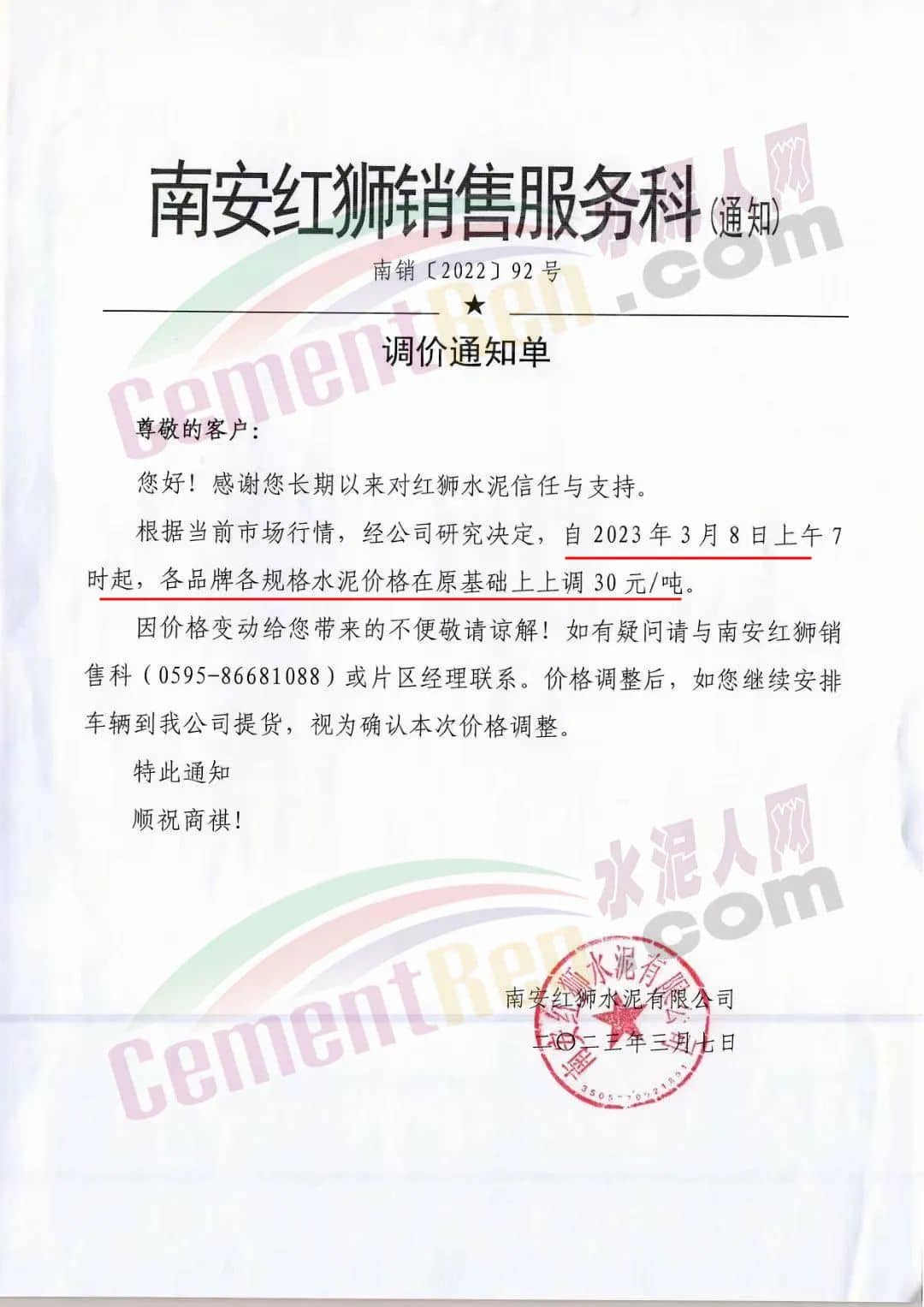 漳平紅獅銷售服務科通知,3月8日上午7時起,各規格品種水泥合同價上調30元/噸。