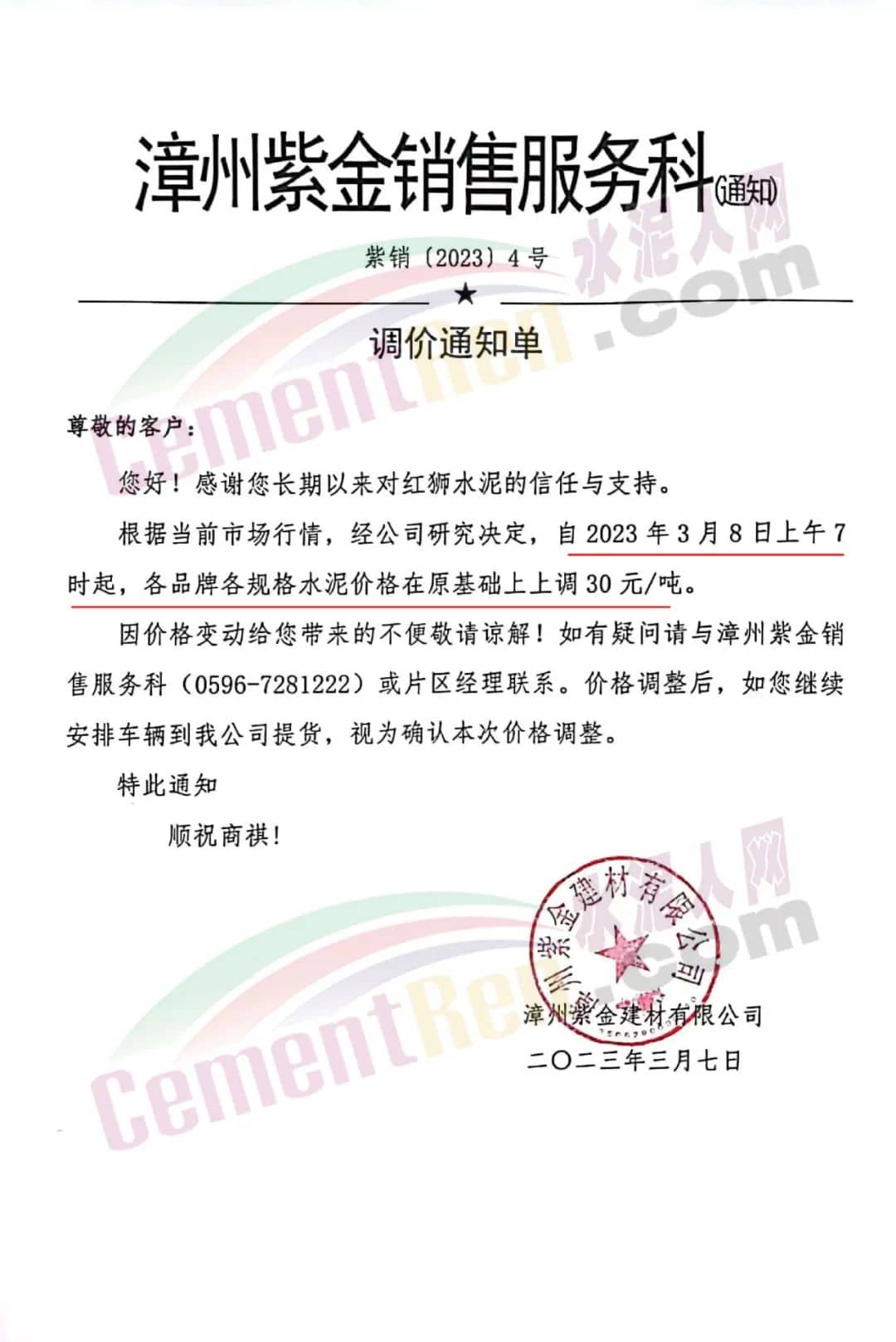 漳州紫金建材有限公司通知,自3月8日上午7時起,各品牌各規格水泥價格在原基礎上上調30元/噸。
