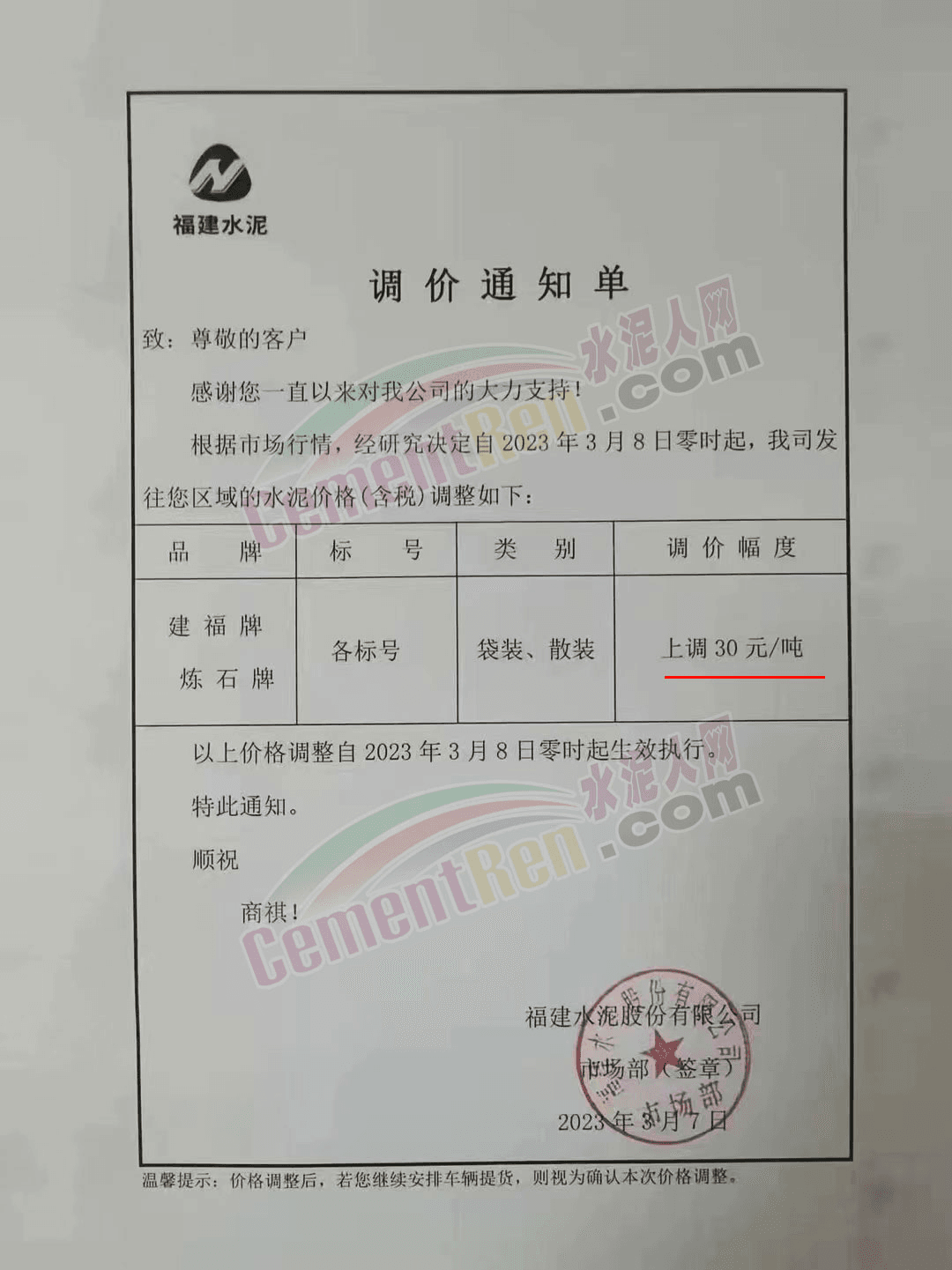 福建水泥通知,建福牌,煉石牌各標號水泥3月8日零時起,上調30元/噸。