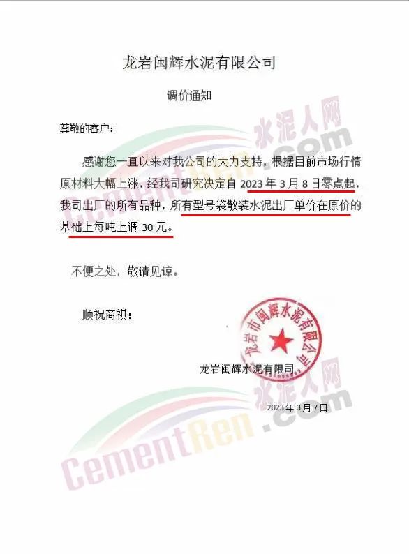 龍巖閩輝水泥有限公司通知,根據當前市場行情 ,原材料大幅上漲,經公司研究決定自3月8日零點起,公司出廠的所有品種,所有型號袋散裝水泥出廠單價在原價基礎上每噸上調30元。
