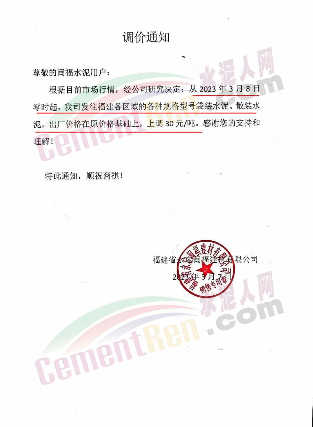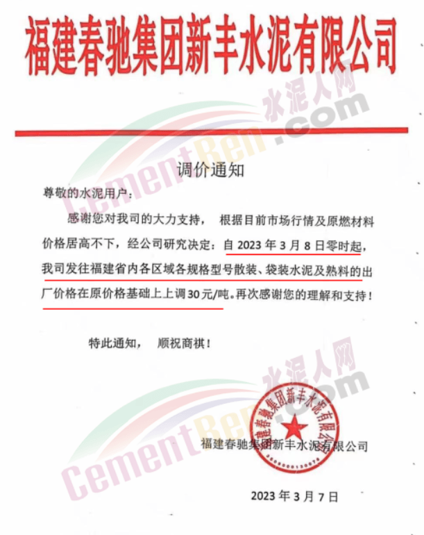 福建春馳集團新豐水泥有限公司通知,根據目前市場行情 及原燃材料價格居高不下,經公司研究決定,自3月8日零時起,公司發往福建省內各區域各規格型號散裝、袋裝水泥及熟料的出廠價在原價基礎上上調30元/噸。