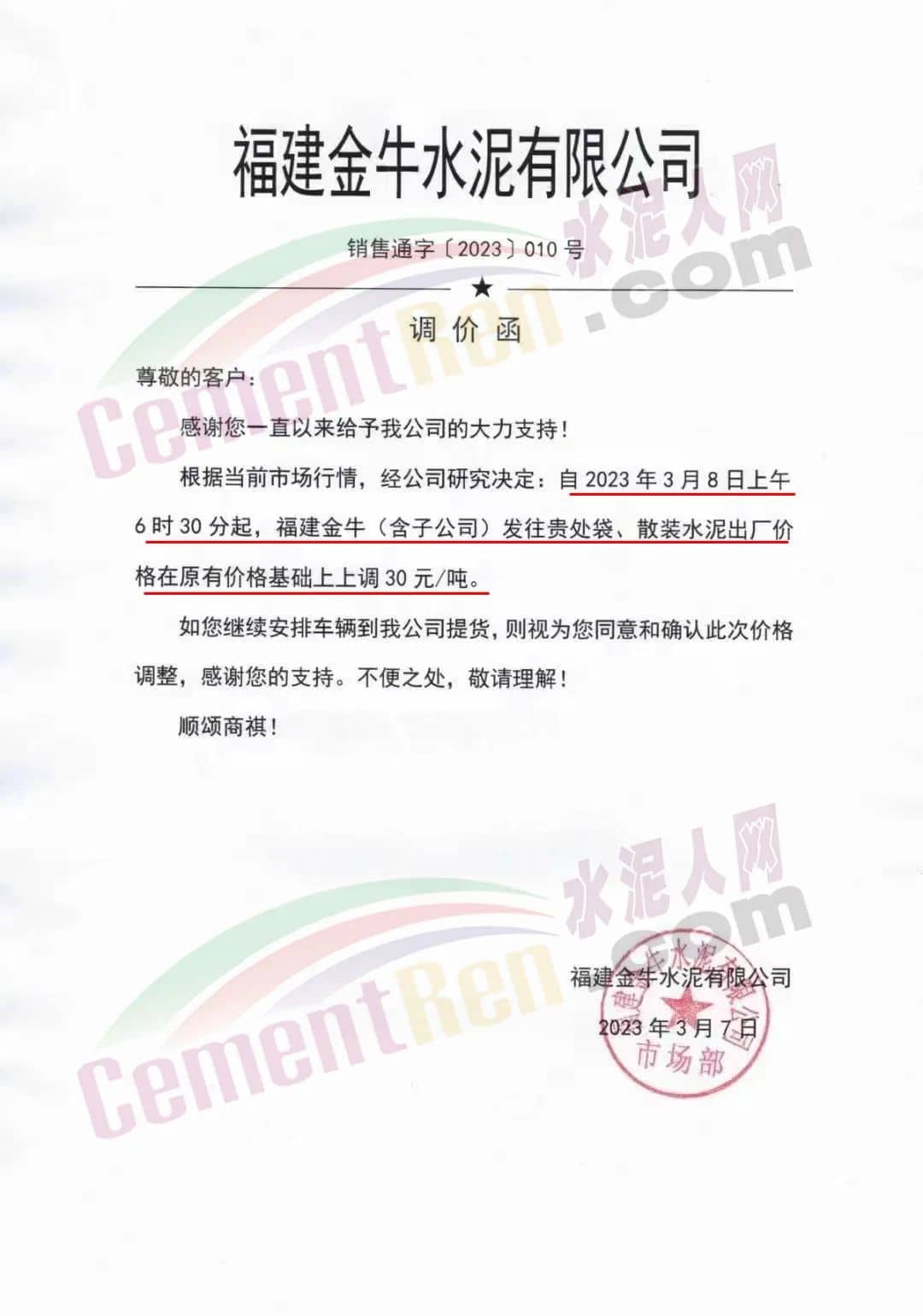 福建金牛水泥有限公司通知,自3月8日上午6時30分起,水泥出廠價上調30元/噸。