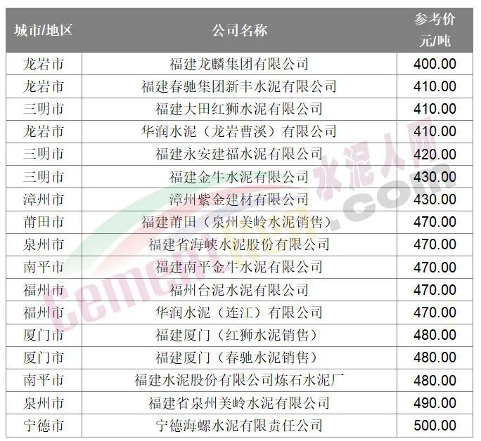 從水泥人網信息中心參考報價可見,本次調價前,福建市場水泥報價在400-500元/噸之間。