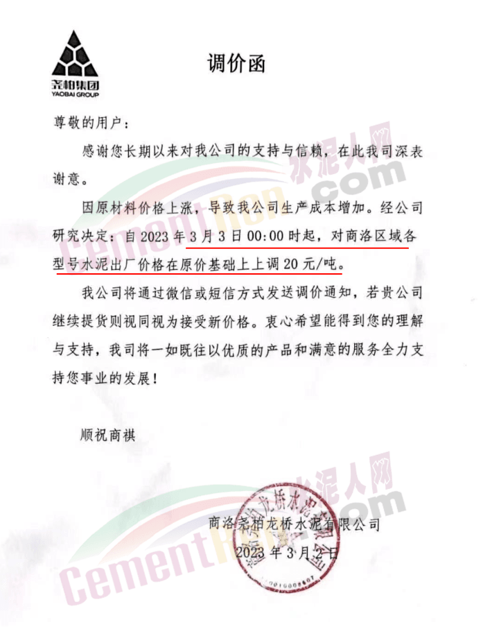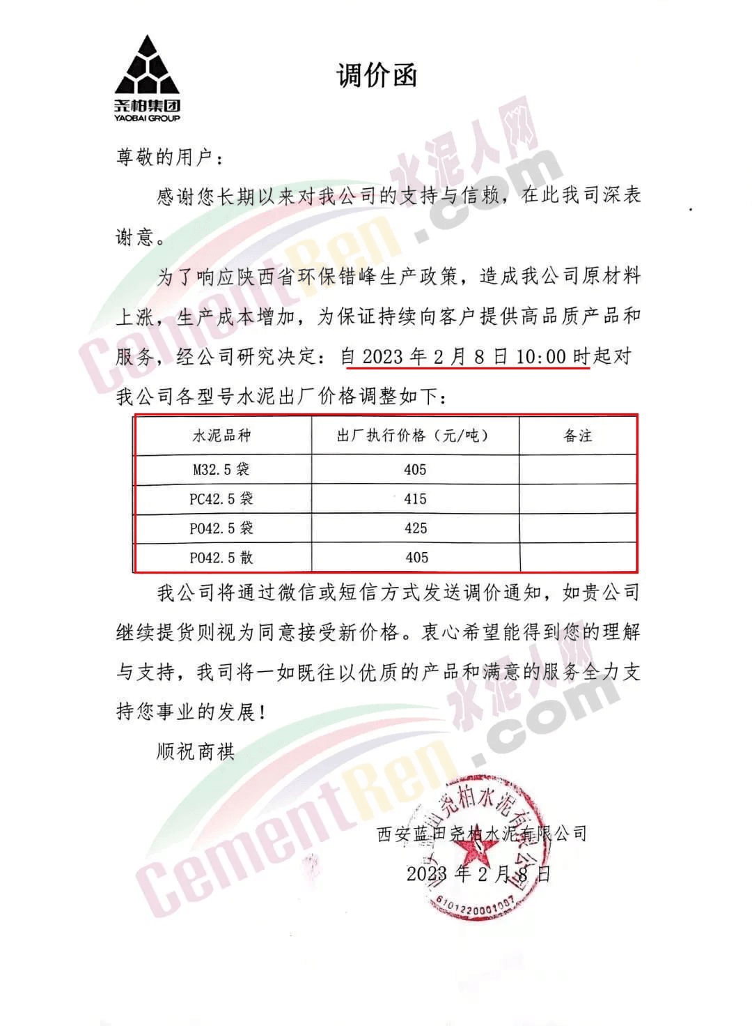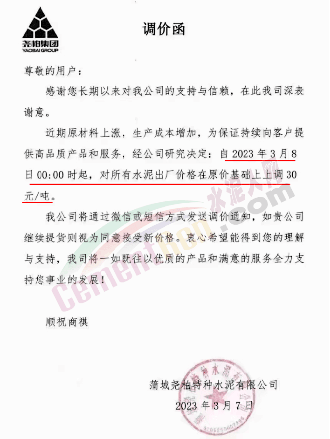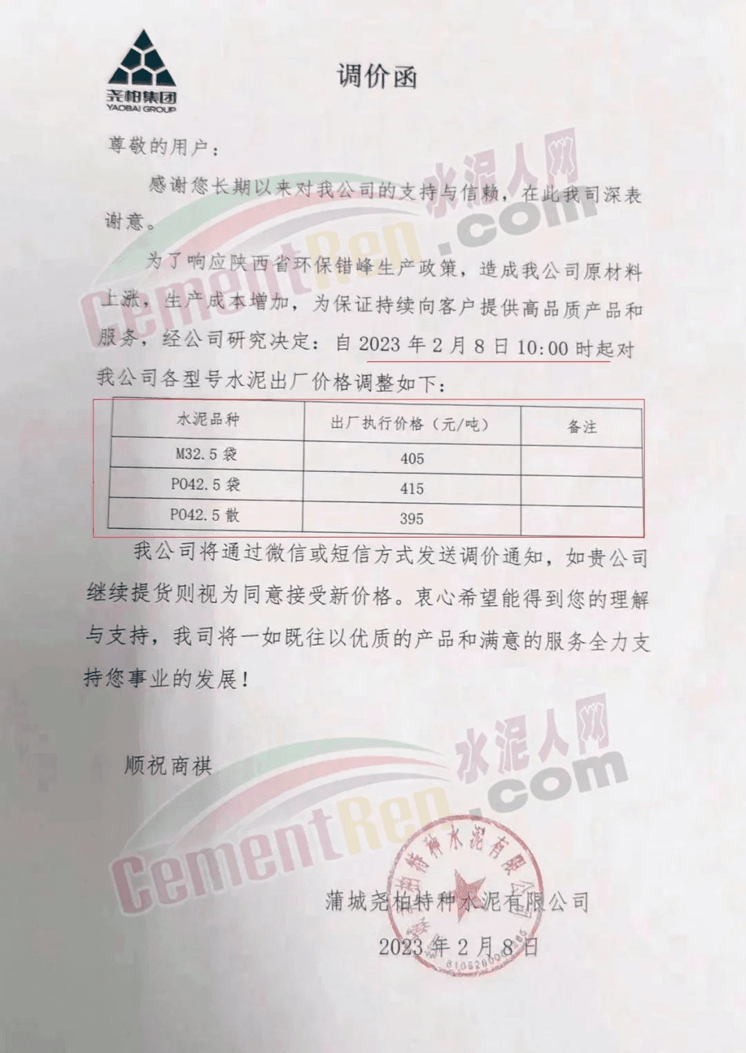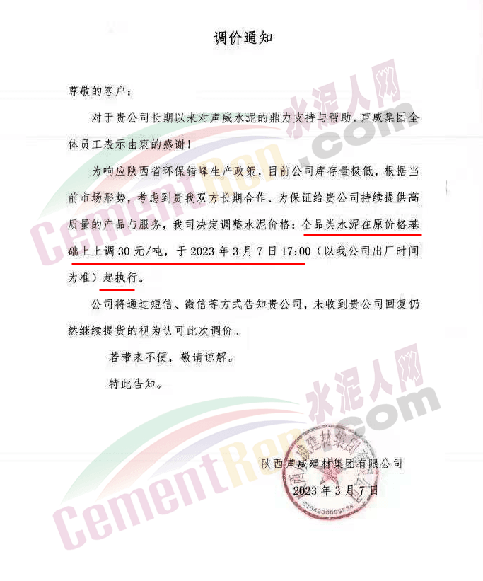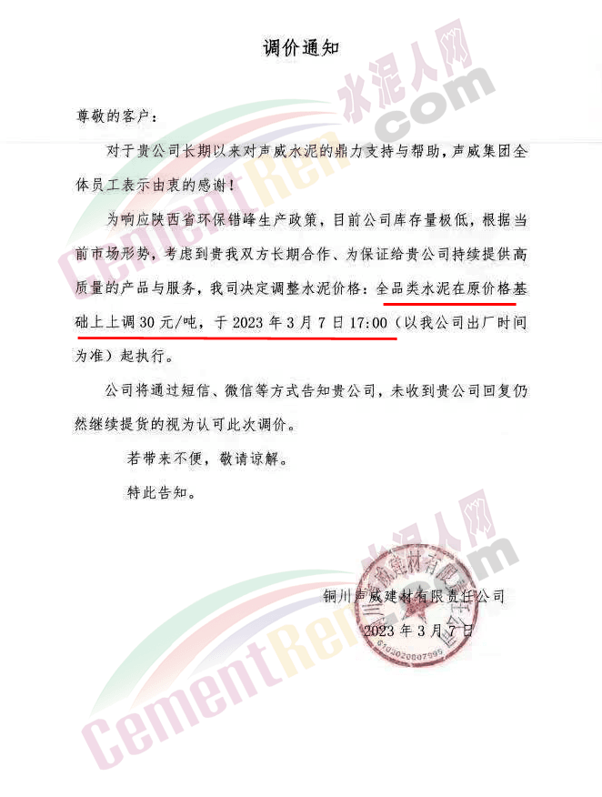 陜西聲威建材集團有限公司、銅川聲威建材有限責任公司通知稱,為響應陜西省環保錯峰生產政策,目前公司庫存量極低,根據當前市場形勢,于2023年3月7日17時起公司全品類水泥在原價基礎上上調30元/噸。