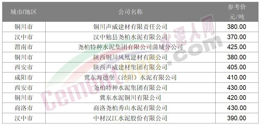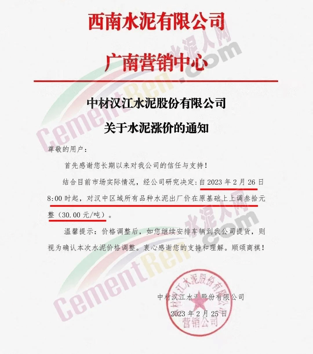 2月26日,陜西漢中地區堯柏水泥、中材水泥等主要品牌企業通知上調水泥價格30元/噸。