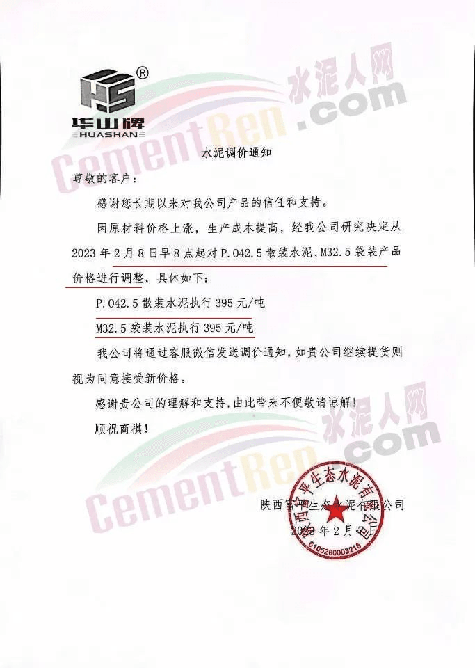 水泥人網注意到,2月9日各企業的通知函明確了出廠價格為395-405元/噸。3月8日通知函只寫了上調30元/噸,也就是上調后水泥出廠價為425~430元/噸。