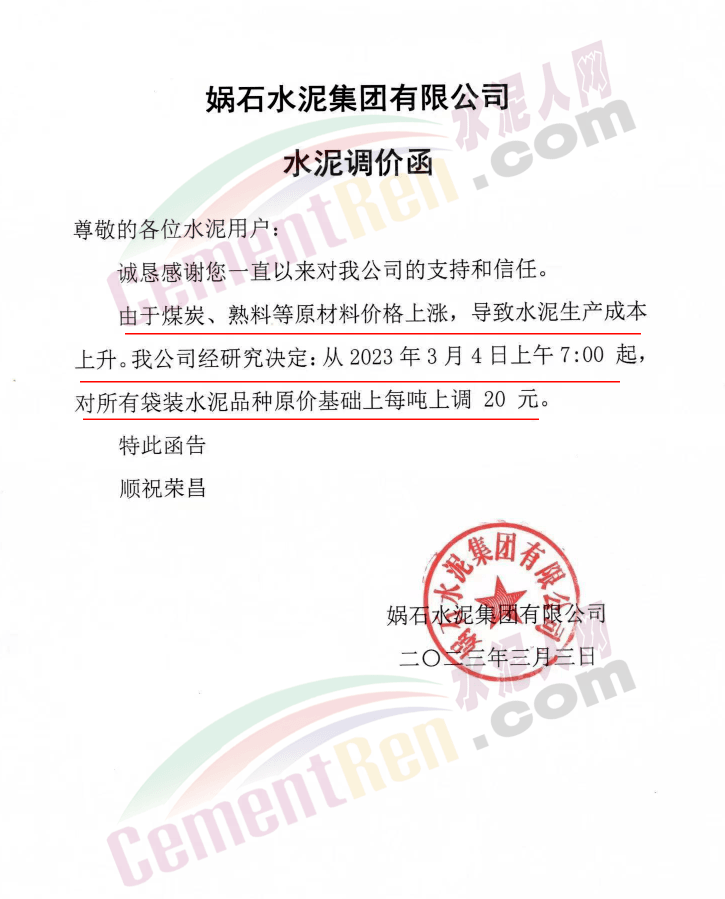 湖北媧石水泥集團有限公司此前通知所有袋裝水泥品種在原價基礎上上調20元/噸。
