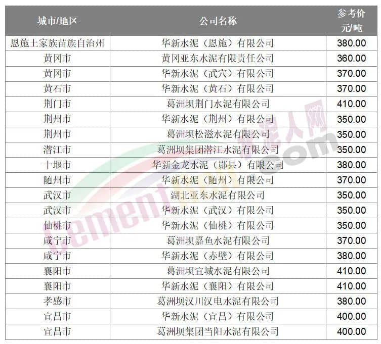 水泥人網信息中心數據顯示,近期湖北各區域P.O42.5散裝水泥報價在340-410元/噸左右。武漢兩家主要品牌企業華新水泥、亞東水泥報價350元/噸,黃石大冶尖峰和華新水泥分別報價350元/噸和370元/噸。從湖北各區域主要品牌企業報價來看,華新、葛洲壩、亞東水泥近期報價基本一致,差價相對較小。