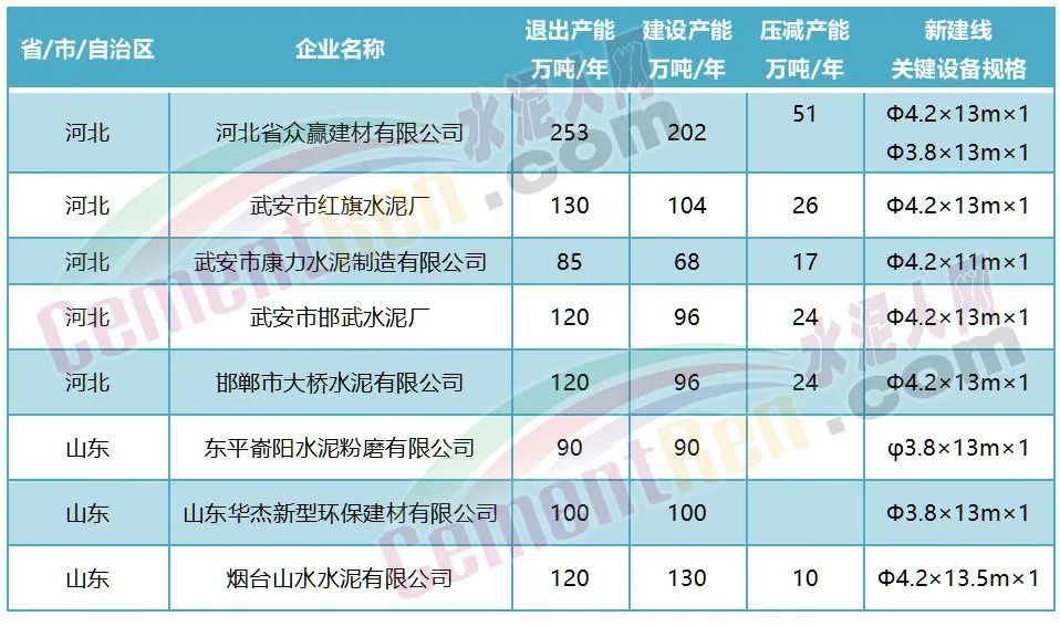 其中河北省眾贏建材有限公司整合五家水泥粉磨企業退出253萬噸/年粉磨產能,用于新建兩條水泥粉磨生產線,壓減粉磨產能51萬噸/年。